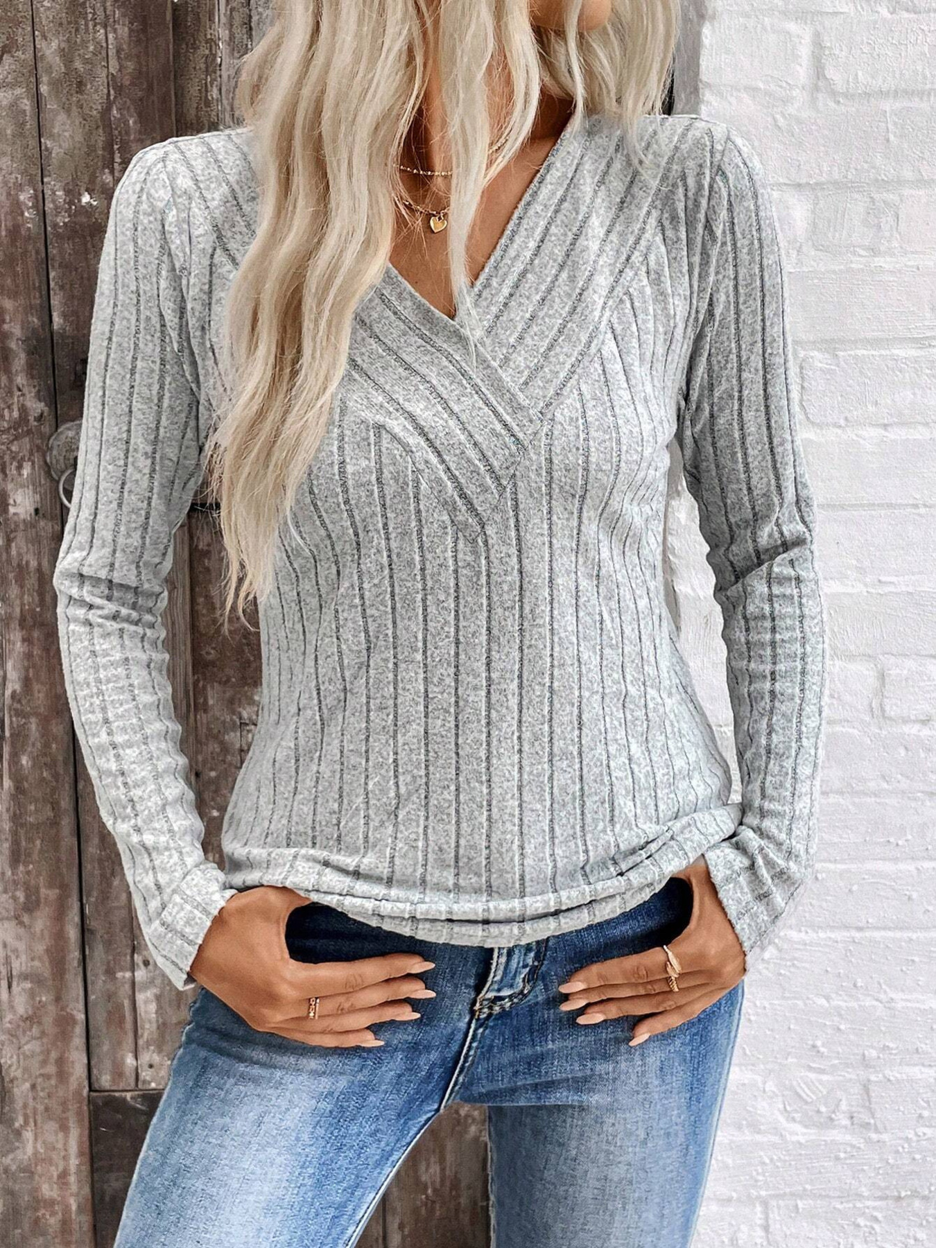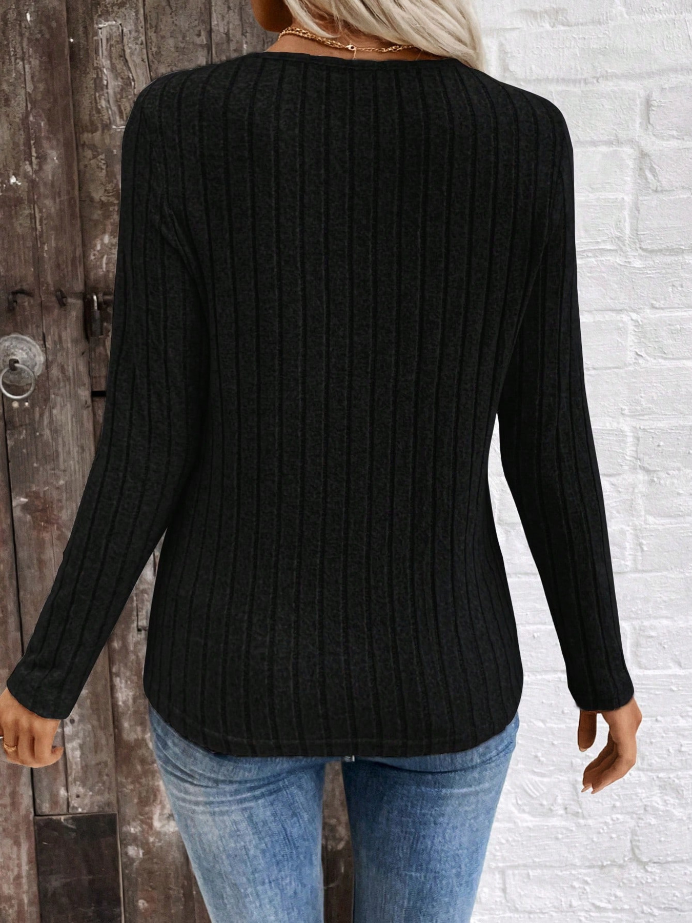 Ribbed V-Neck Long Sleeve Knit T-Shirt