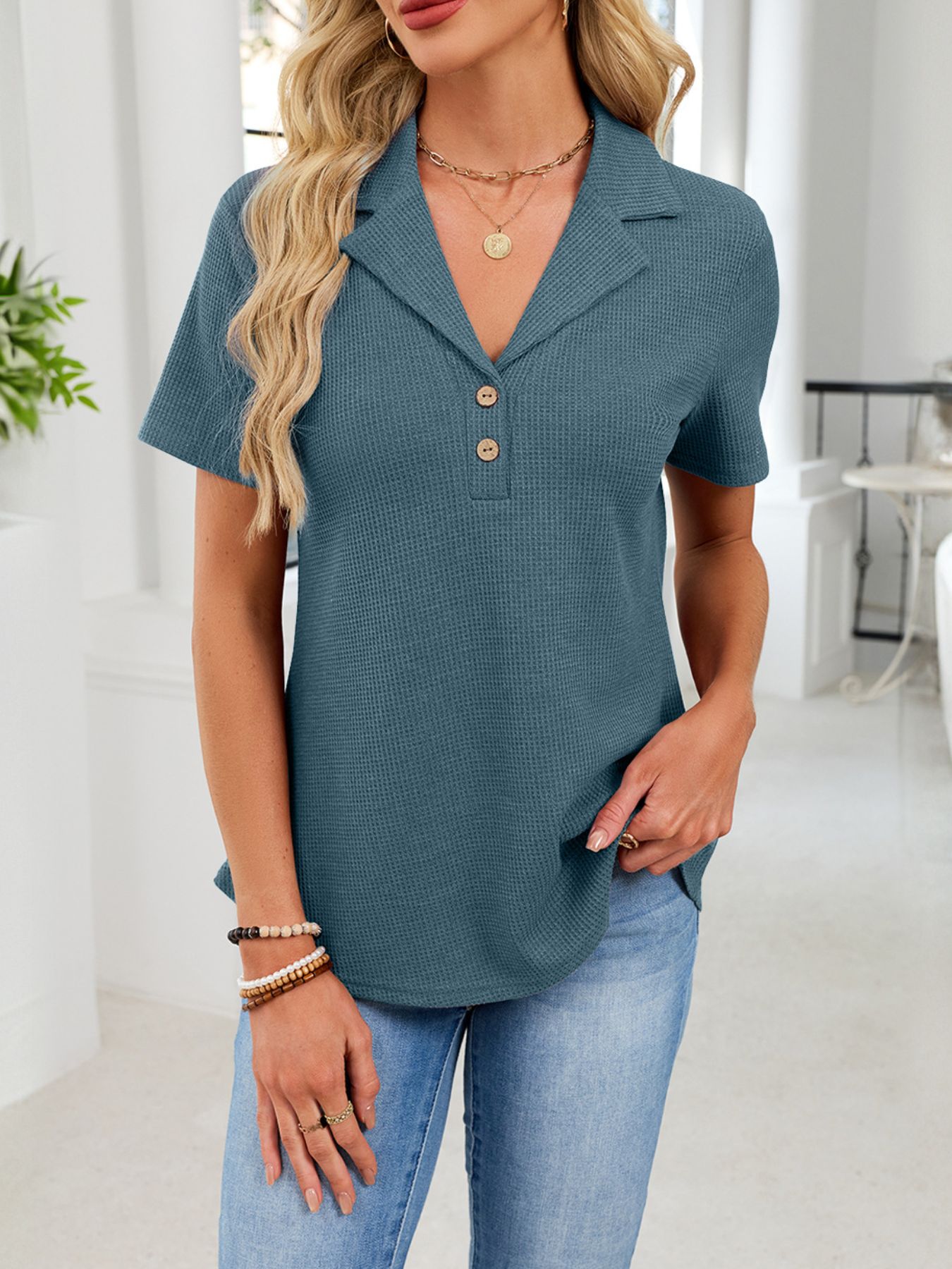 Waffle Knit Button Detail T-Shirt