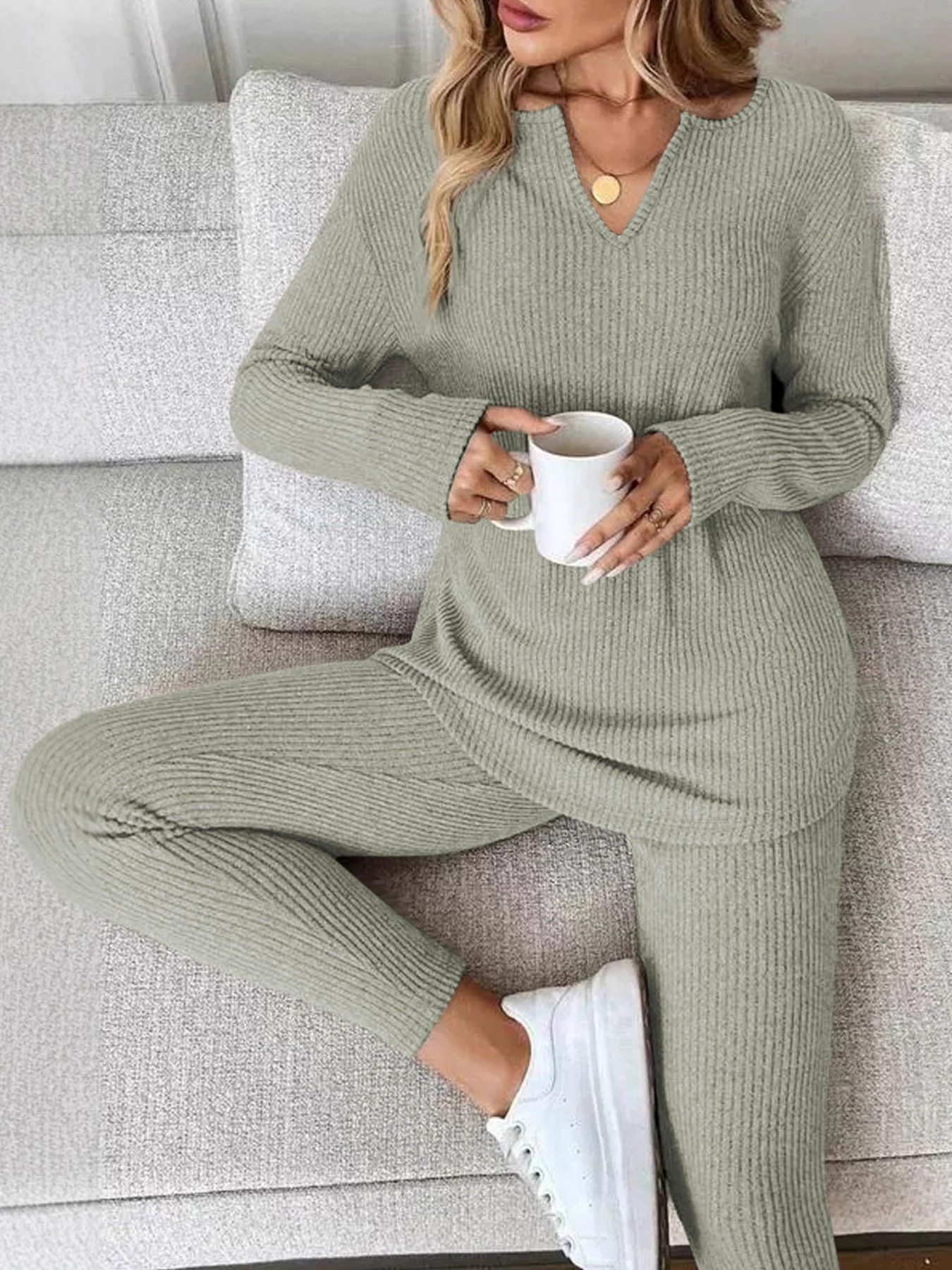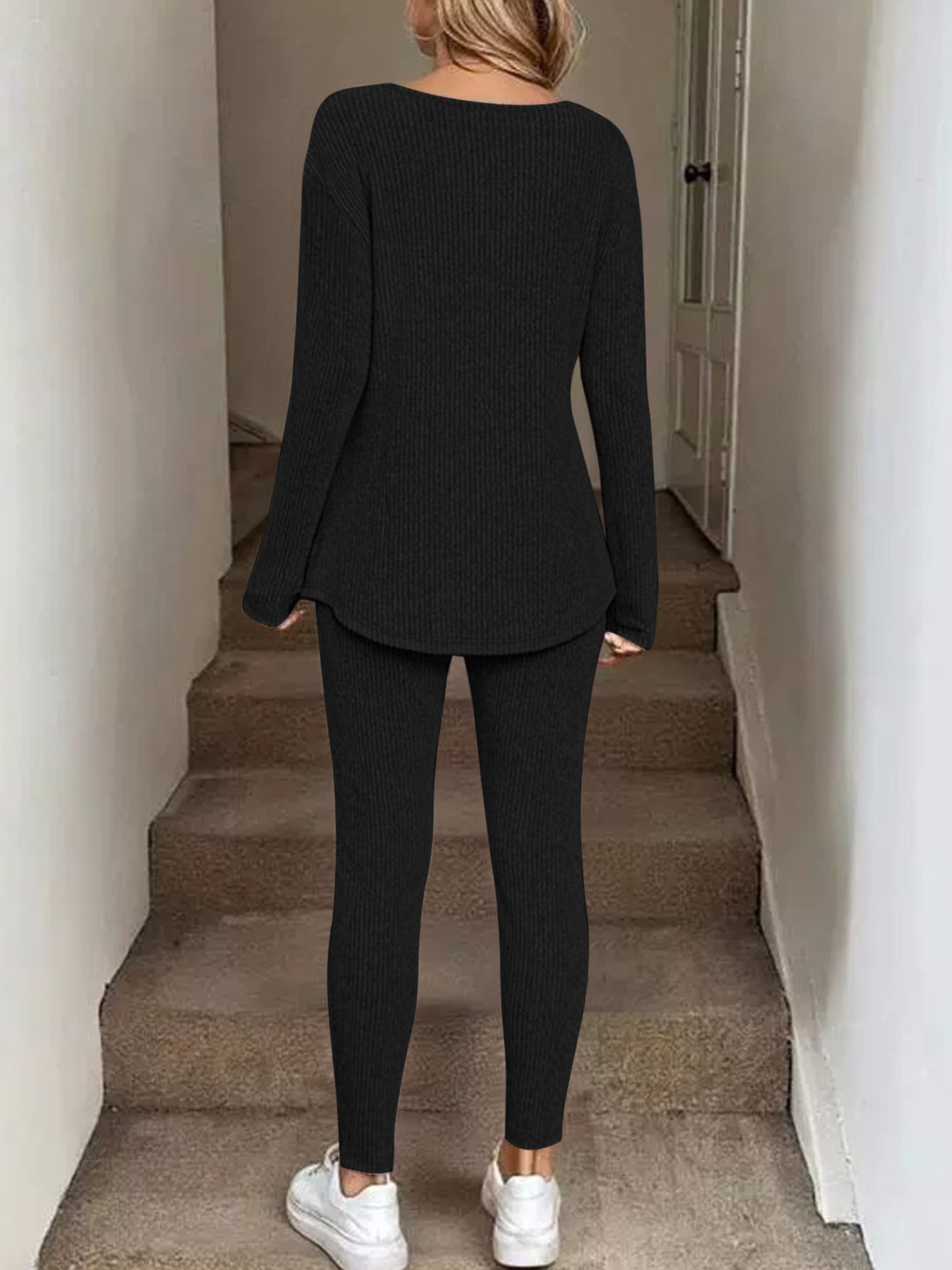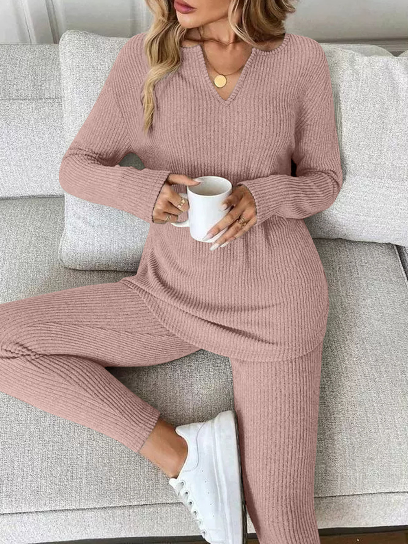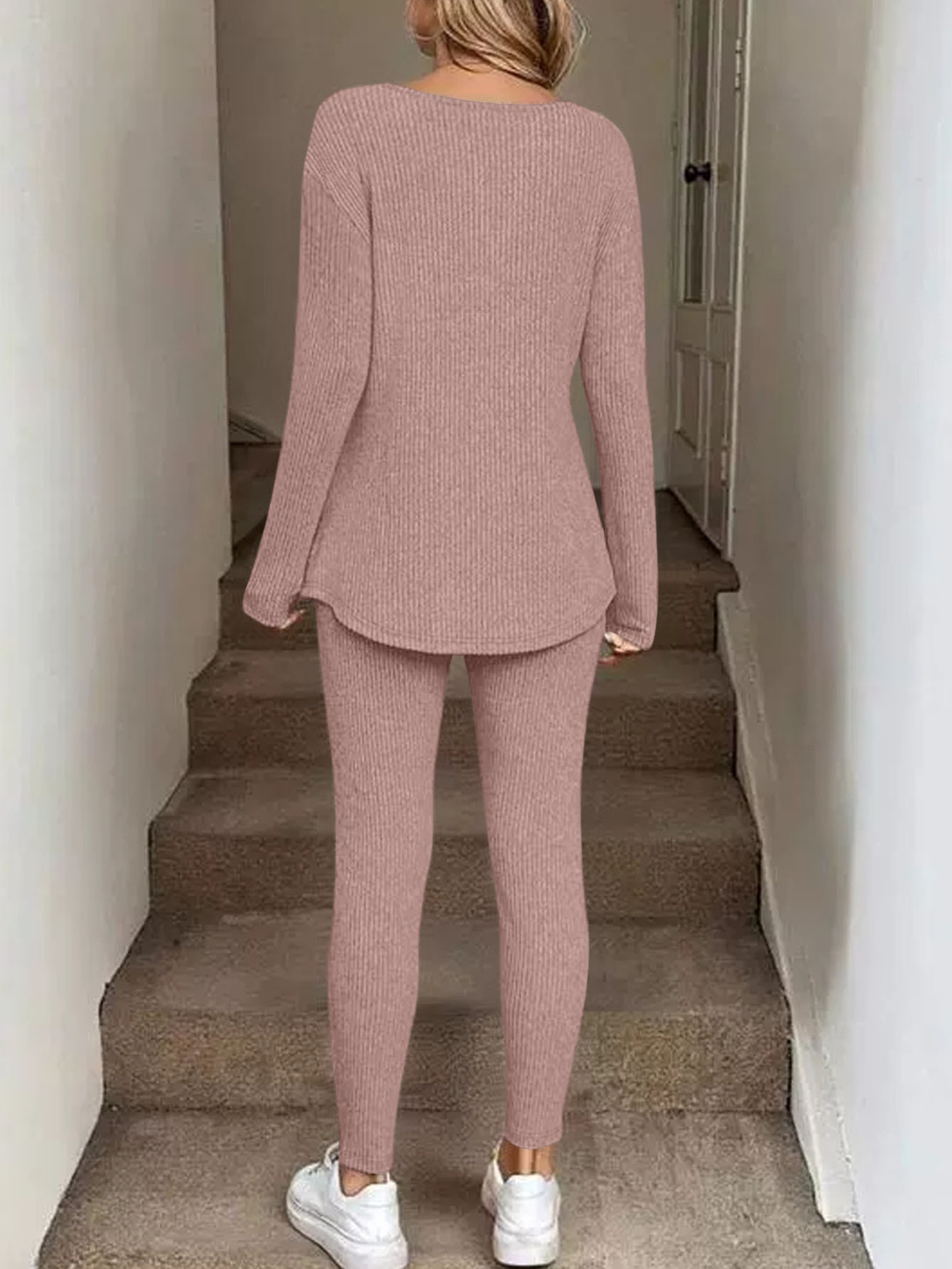 Ribbed Knit Long Sleeve Top And Pants Set