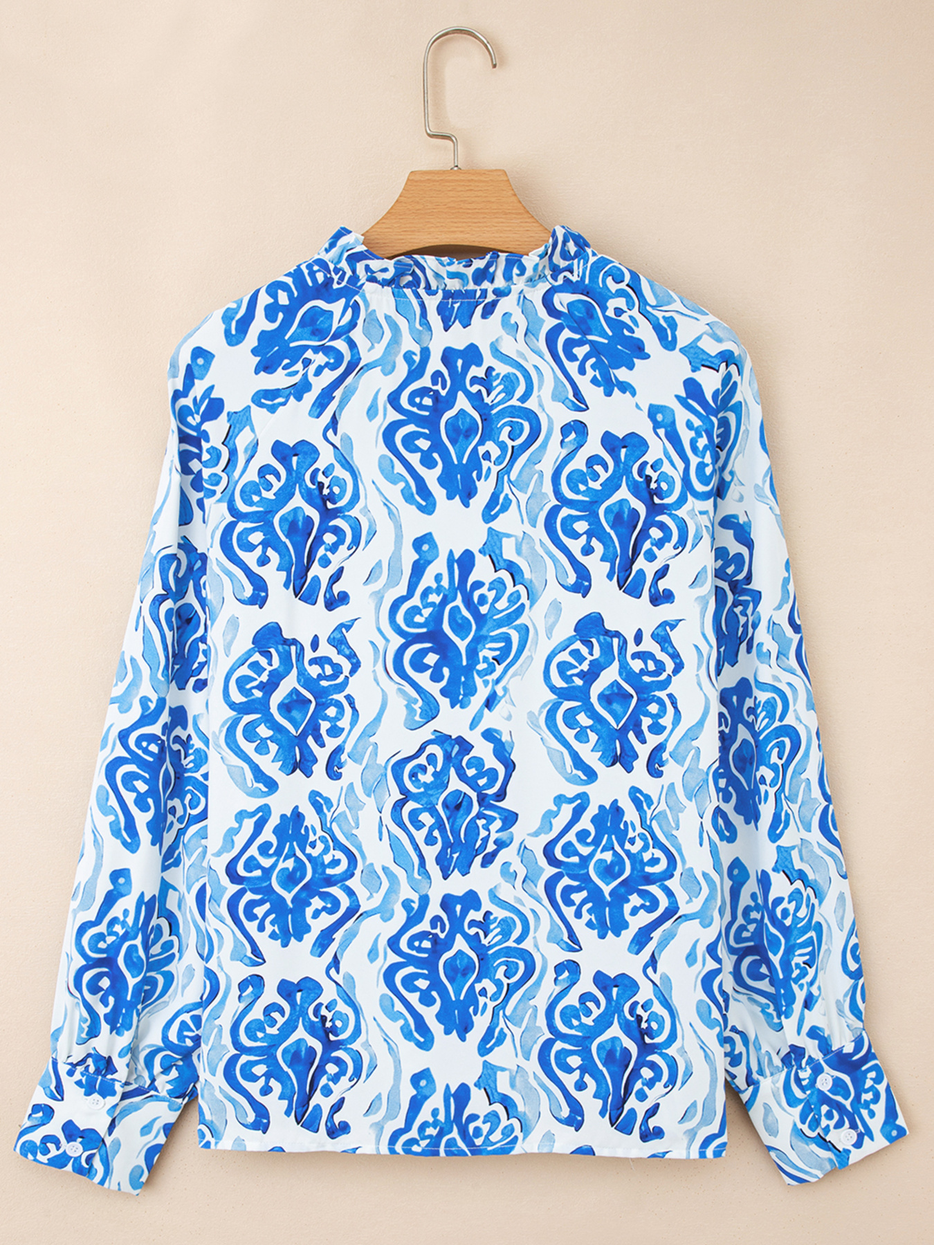 Printed Tie Split Neck Button Front Puff Sleeve Shirt