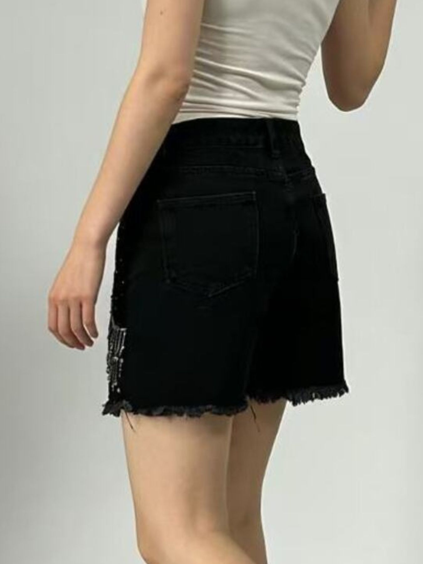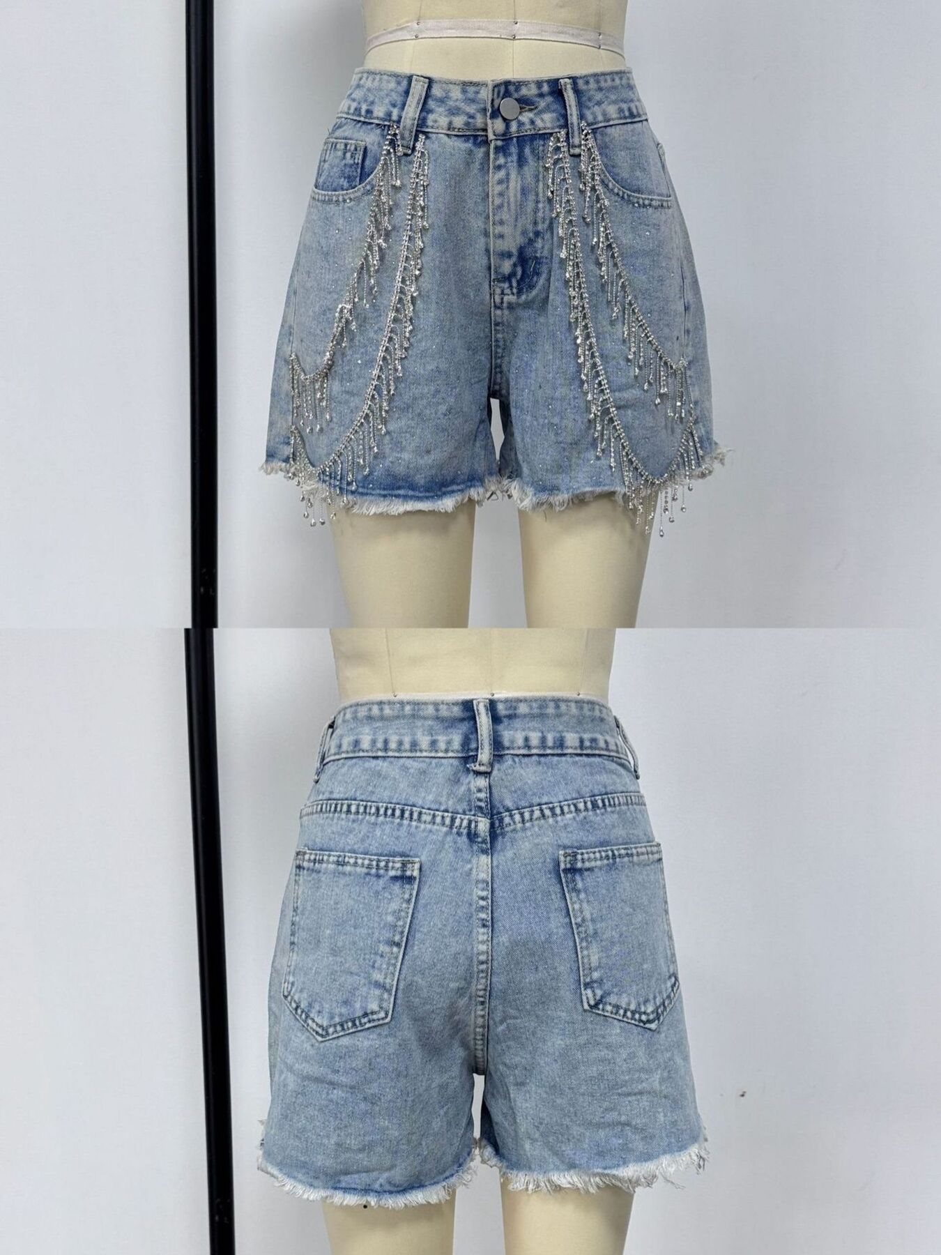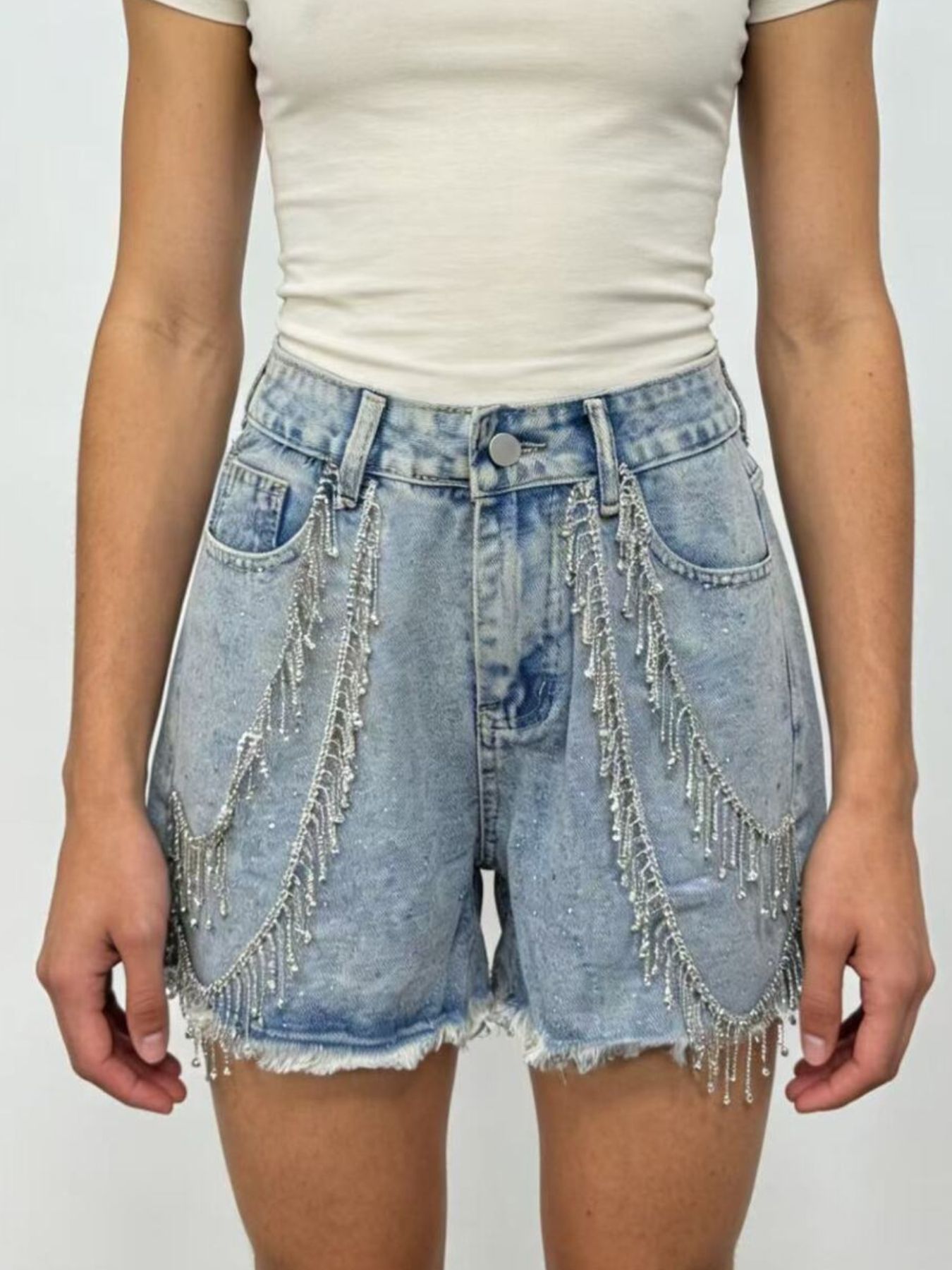 Rhinestone Chain Raw Hem Denim Shorts