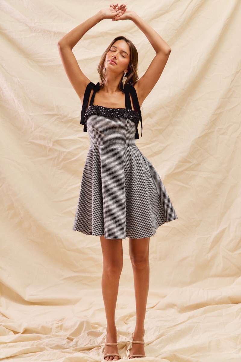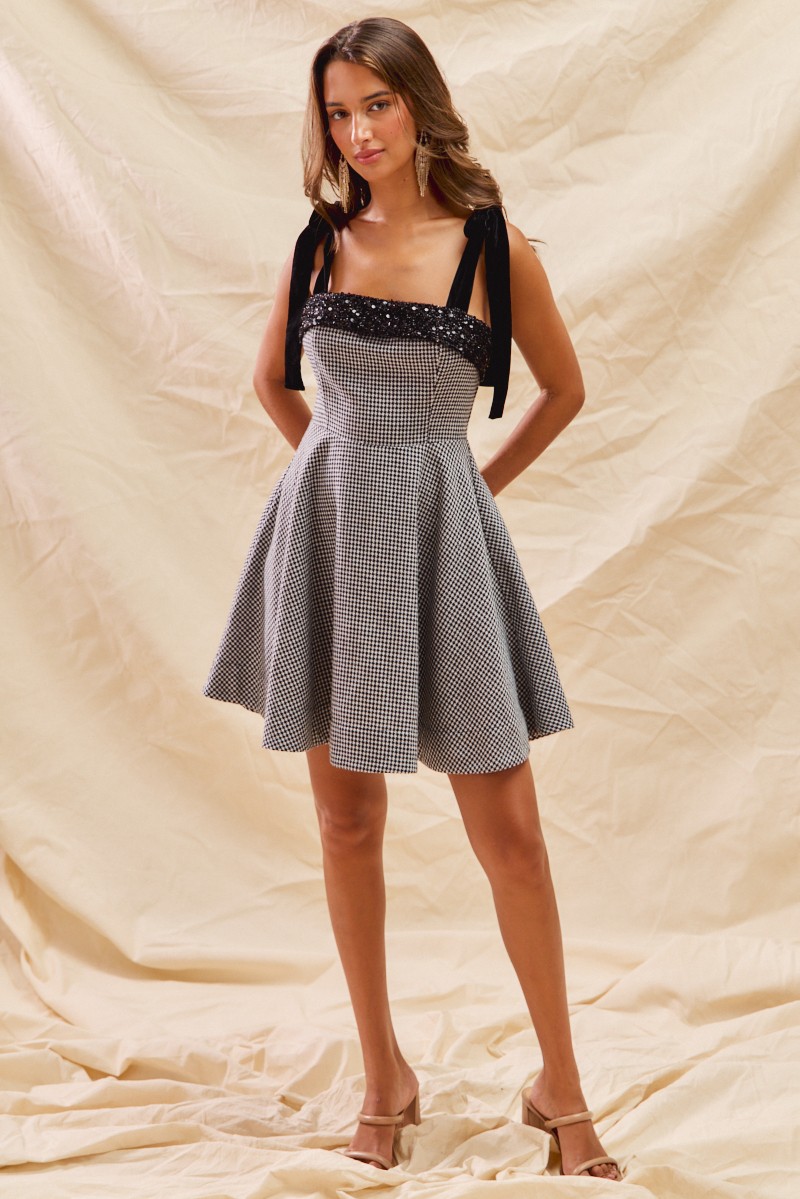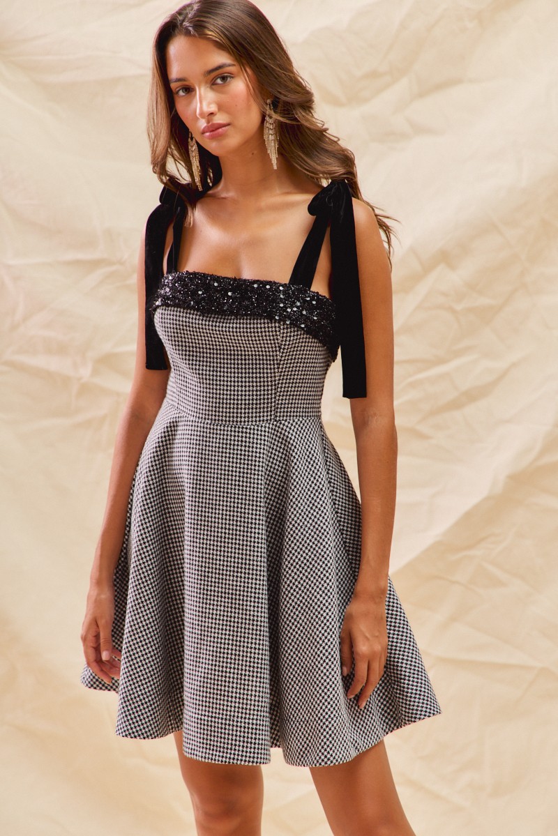 So Me Houndstooth Fit Flare Mini Dress With Shoulder Tie